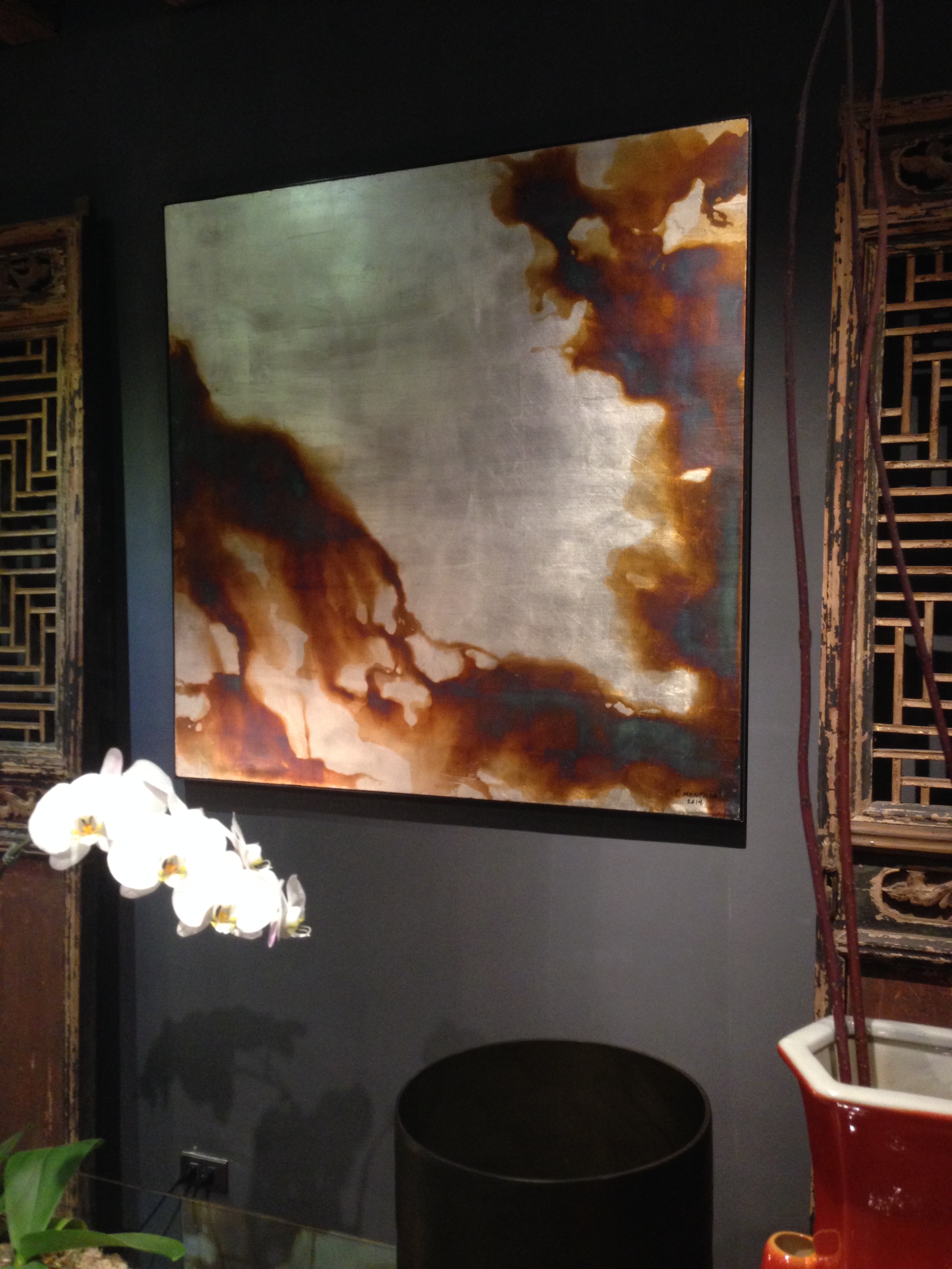 The other featured artists were Tata Montilla, who has a beautiful and unique line of art work. His paintings are made of silver leaf and acid. He puts the acid in a certain way, (and place), on the silver leaf to oxidize it, to achieve colorization and pattern.