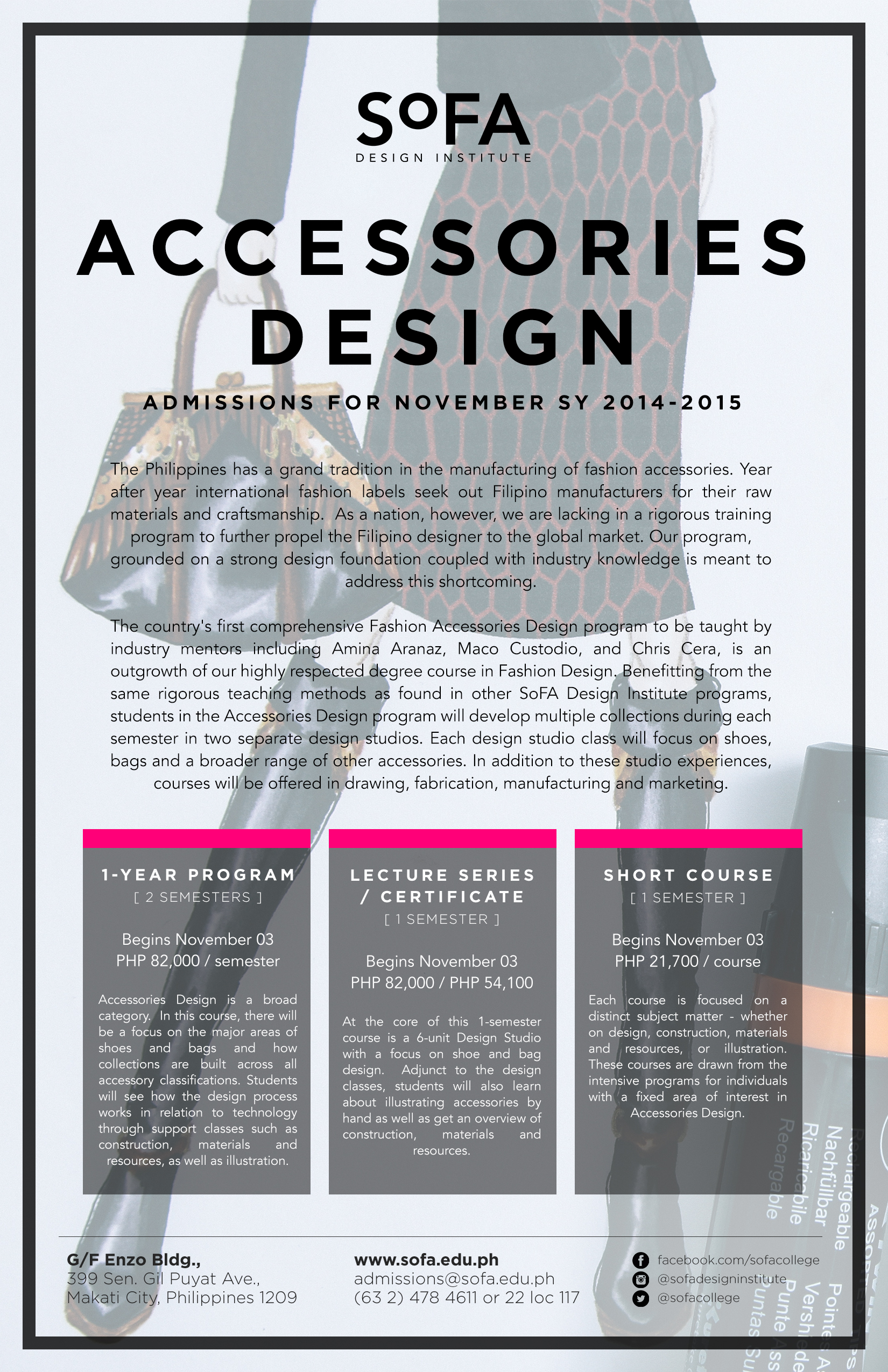The School of Fashion and Arts, SoFA, our country’s premiere design school, has exciting new programs! Even I, am, tempted to enroll. The accessory design class is what’s piquing my curiosity. On the other hand, the big names teaching the furniture design class are amazing! What to do? What to choose? I read through the school’s material on their mission and formula in conveying design aesthetic to their students, and I must say, I was really impressed. Each individual teaching in their specialised field of design is very talented and driven. For those of you who are into the arts and love design like me, SoFA’s programs are something you should really look at and consider. You must hurry though, enrollment is only until November 17 for these two programs.